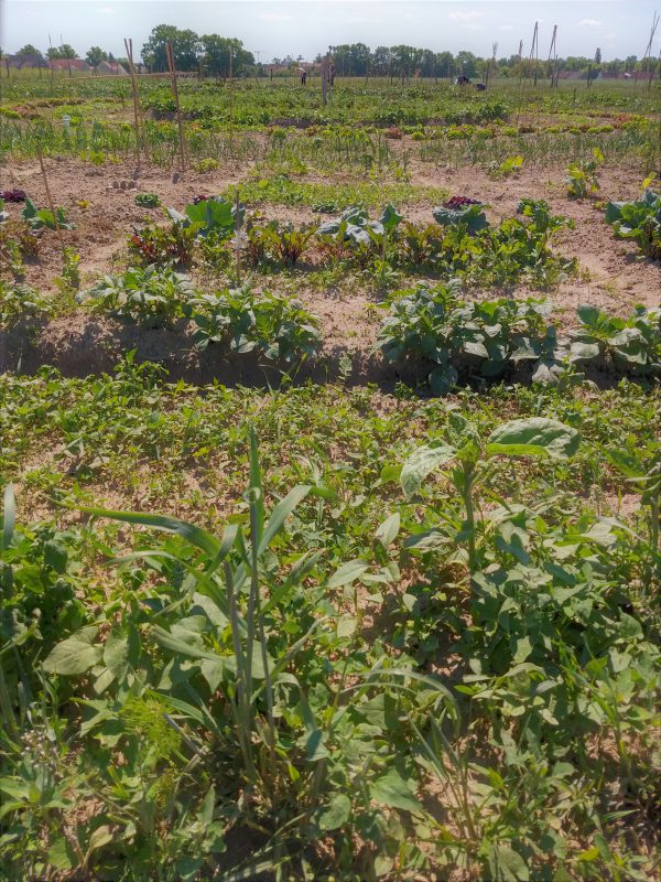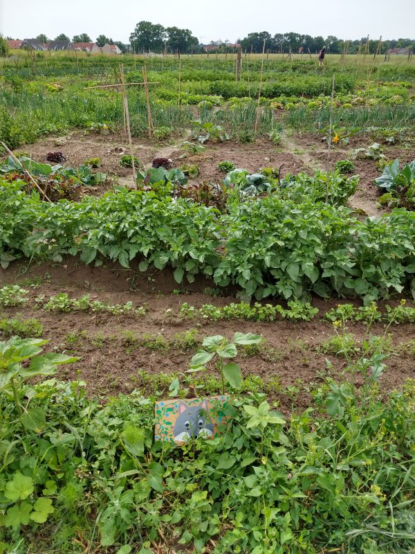 Die Ernte auf meinen 22 Quadratmetern war bisher großartig. Durch die weite Anfahrt und das Ackererlebnis schätze ich sie sogar noch ein klitzekleines bisschen mehr als die vom Nachbarschaftsgarten und die vom Balkon. Da esse ich sogar den doch sehr verlausten Spinat mit Genuss, schwärme tagelang von der Haltbarkeit der Salatköpfe (bis zu eine Woche, wenn man sie vorher ins Wasser taucht!) und bin traurig, wenn ein Wirsing fault. Angebaut werden außerdem Möhren, Pastinaken, rote und gelbe Zwiebeln, zwei Sorten Kartoffeln, Kohl, Zuckererbsen, Bohnen, Rote Bete, Mangold, Zucchini, Gurke, Kürbis, Fenchel, Sellerie, Radieschen, Lauch, Mais, Schnittlauch, Petersilie, Kapuzinerkresse, Dill. Ringsherum und in der Mitte blüht bald eine Blumenreihe, soweit sie nicht versehentlich weggerupft wurde, und in den Kreiszentren sind jeweils ganze Kräutergärten angelegt. Im Laufe des Jahres gibt es mehrmals saisonalen Nachschub für Saatgut und Jungpflanzen. Beachtet man die streng eingehaltene Fruchtfolge und die Bio-Qualität, so darf man auch eigene Samen und Pflanzen mitbringen. Derzeit reicht mir das Angebot aus, aber nächstes Jahr trete ich in die Fußstapfen meiner Nachbarin und bestelle Neuseeländischen Spinat bei Annas Jungpflanzenmanufaktur vor und bringe Pflanzen aus meiner eigenen recht ansehnlichen Tomatenanzucht vom Balkon mit.