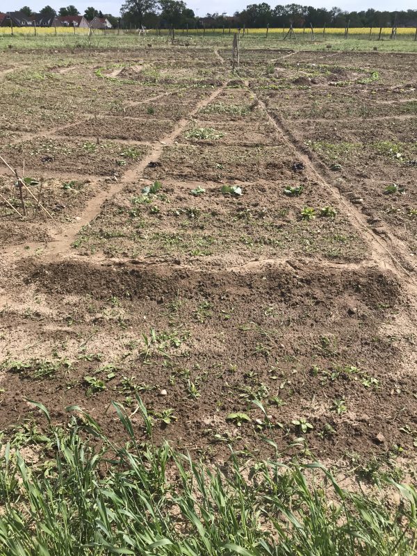 Ach überhaupt, der bauerngarten. Meine beste Entscheidung im letzten Herbst war es, eine Parzelle vom bauerngarten Mette zu pachten. Geliebäugelt hatte ich damit schon länger, den Ausschlag gab dann ein Flyer am Schwarzen Brett hier im Ortolanweg. Der Aushang hieß ja zugleich, dass andere Mieter*innen mindestens einmal in der Woche die sechs km nach Großziethen, also schon nach Brandenburg, fahren, um dort regelmäßig rund vier Stunden zu hacken, zu jäten, zu mulchen und zwischendurch zu säen, zu pflanzen und zu ernten. Als sich herausstellte, dass eine Nachbarin aus der Garten-AG dort ebenfalls gärtnert, war die Entscheidung schnell gefallen. Denn so kann ich ab und an im Auto zum Acker mitfahren, um Tomatenstangen zu transportieren oder die Ernte schnell nach Hause zu bringen.